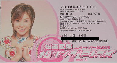 | いよいよ待ちに待ったあややのライブツアーの開幕である。思い返してみてもお正月のハロプロライブ、そしてミュージカル「草原の人」と2003年も頼もしいほどの活躍ぶりを続けてきてくれていたので、春ツアーの初日=今年初の単独ライブと言うのはかえって不思議な感じがする。それだけあややがファンにとって身近な存在であり続けてくれるという意味なのであろう。 毎回毎回楽しい演出や、ツアー中でもセットリストを組み替えて常に新曲を加え続けるなど、何度何度足を運んでもけして期待を裏切らないと言う印象を覚えるあややのライブであるが、今回は去る1月29日に発売されたあやや自身2枚目のオリジナルアルバム『T・W・O』を受けてのツアーとなるかと思われる。それ故にセットリスト的にも大幅な入換が予想され、自身大いに楽しみにしているところである。 今回運良くお仲間のMaさんにツアー初日、しかも昼公演のチケットを確保して頂いたのでありがたくご同行させていただく事にした。正真正銘今年一発目のライブ、あやや自身は勿論の事、ファンも多いに緊張させられるライブとなりえよう。…と言う訳で、例によってこの時の様子を完全実況後中継させて頂きたいと思う。 ☆とりあえず前置きが長いので、ライブレポへワープされたい方はこちら!! ライブの会場となったのは「松戸森のホール21」である。松戸と言うので松戸駅の方にあるのかと勝手に想像していたのであるが、実際には市街地からは少し離れた八柱と言うところにあるようだ。駐車場も460台分完備してあるとの事なので、家から自動車で出発。フタ自身は江戸川を挟んだ対岸に住んでいるので、さほどアクセスに時間がかからないだろうとタカを括っていたが、さすが日曜と言う事もあり、中山競馬場へアクセスする者や、加えて花見に繰り出す者のであろうか、道中は結構混雑していたと言う印象があった。しかしながら駐車場が無くなることを懸念してかなり余裕を持って家を出発した甲斐があって、開演2時間半前、13時前には到着する事が出来た。 ただしちょっとしたトラブルに見舞われた。その名の通り同会場は森の中にあるのであるが、この森がまたバカでかい。最初車を運転していて同会場を見つけたので回り込むべく左折をしてみたのであるが、一向に駐車場らしきものがみつからない。さてどうしたものかと更に走らせてみれば、ようやく森が途切れそうになった時に西駐車場と書かれた駐車場を発見することが出来た。 「結構会場から離れているけれど、まぁ〜、歩けばいいだけのことか・・・」 そう諦めてここに停めにかかるが、駐車場のゲートのところで駐車料金500円を機械に入れなくてはならなかったにも拘らず、その500円分の小銭が手許にない(汗)。財布を見てみても入っているのは1万円札に何故か2000円札が1枚。ホント、この2000円札と言う奴は使えないですね〜。小銭入れをひっかき回しても500円分の小銭はなく、車中を探してみても僅かばかりの小銭しか残っていない…。 「これは車をバックさせてみてどこかで両替して来るしかないかなぁ〜」 と思いきや、すでに後続の自動車が付けていて、バッグもままならない状況だった(苦)。 「う〜ん、どうしよう…」 改めて小銭を数え直してみれば、なんとか490円分の小銭があることが判明した。後は1円と5円ばかりであり。そこで車をおもむろに降り、後ろの車のドアーをノック・・・、 「すいません、これ、10円玉に交換してくださいませんか?」 と申し入れたところ、快く5円玉2枚を10円玉1枚に交換して頂けて、無事事なきを得たことであった。 ところがこの話はまだ終わらない。ライブレポはいつ始まるのかと思われる方、もう少しご辛抱下さい(苦笑)。駐車してはたと気がついたことに、この駐車場どうやら17時で閉鎖してしまうらしい。ライブが終了するのは15時30分公演開始としてそこから2時間と踏んでも17時30分。どう考えても17時の閉門時間に間に合う訳がない。そこで車の誘導をしていたおじさんに事の詳細を確かめる。 「すいません〜。この駐車場は5時(17時)で閉まってしまうのですか?」 「あぁ〜、そうだよ」 やはりそうらしい(苦)。話をまとめるとこの駐車場は森にバーベキューに来るための方のための駐車場だったようだ。それならば17時で閉門する理由は分からないでは無いのであるが、一方で折角苦心して駐車させたにも関わらず、もう一度これを出さざるを得ないようだ。 「5時(17時)で閉まらない駐車場は無いのですか?」 と続けて聞いてみれば、 「この先の私道をまっすぐ行って、信号を右にまがったところ、プロパンタンクの脇の駐車場ならば大丈夫だよ」 との回答を得た。これなら即決で移動をする他無さそうだと思われたが、 「でも今日は松浦なんとかって言うのが来ていて、2000人位来るから、駐車場空いているかなぁ〜」 と、なんとも的を得ない回答である(苦)。とりあえずおじさんの話をまとめると一刻もここから